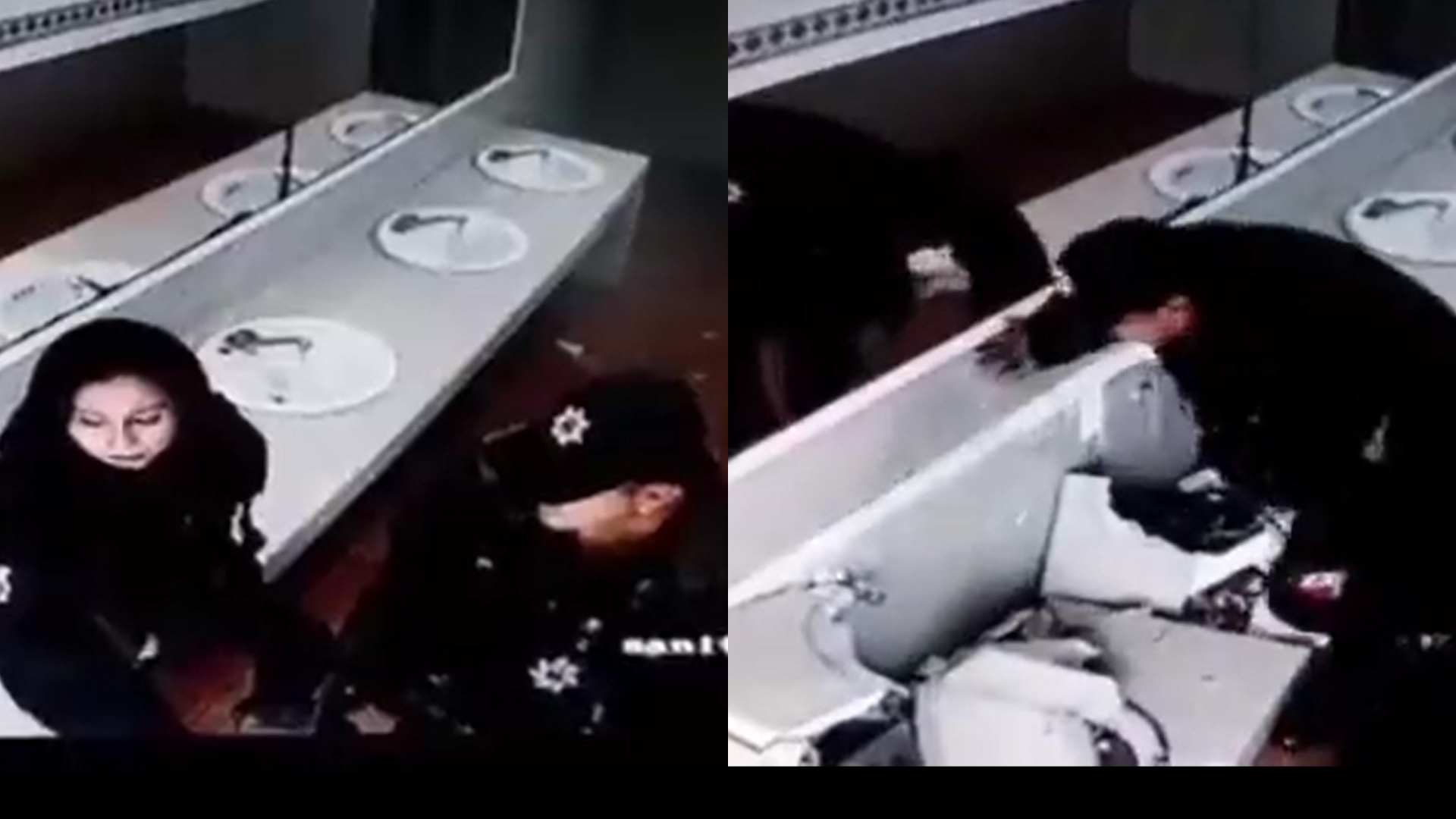 Cuando el video comienza, se puede ver a una uniformada sentada sobre una columna de lavamanos de los baños públicos mientras está en compañía de un colega.