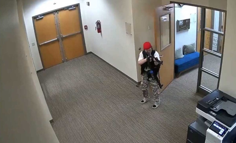 En un video difundido por medios de Estados Unidos, se observa a la mujer, de 28 años, entrar a la escuela tras disparar directamente a la puerta de cristal con un rifle.