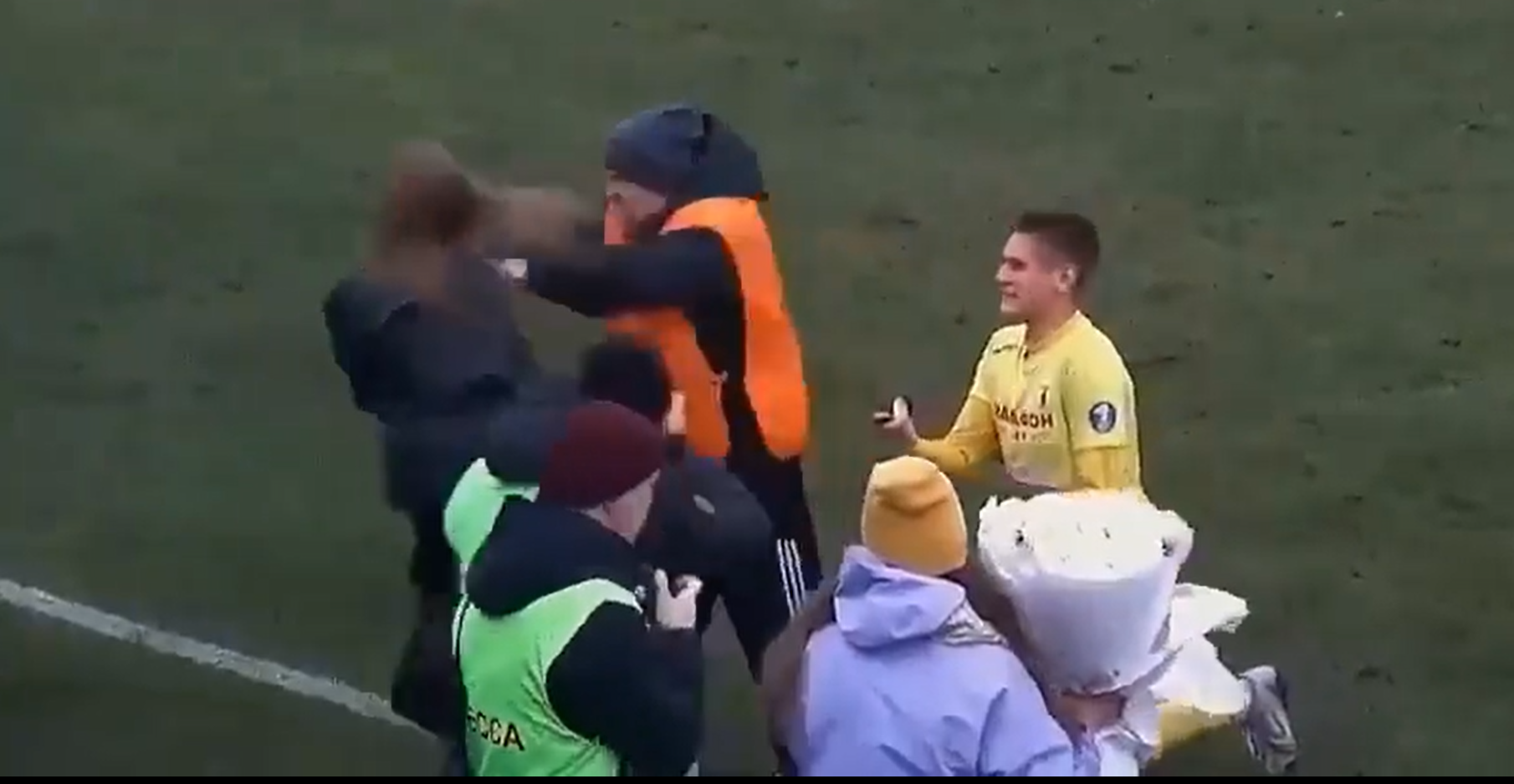 Pero, en ese momento, cuando el futuro marido está ya a punto de pronunciar la pregunta, uno de los guardias de seguridad confunde a la mujer con alguien que quiere ingresar al terreno de juego y le pega un empujón para sacarla de allí.