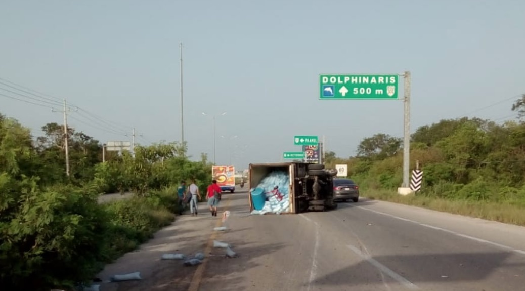 Un camión de carga volcó esta mañana, alrededor de las 9:20 horas, en el tramo carretero que va hacia Tulum, a la altura del hotel Hard Rock.